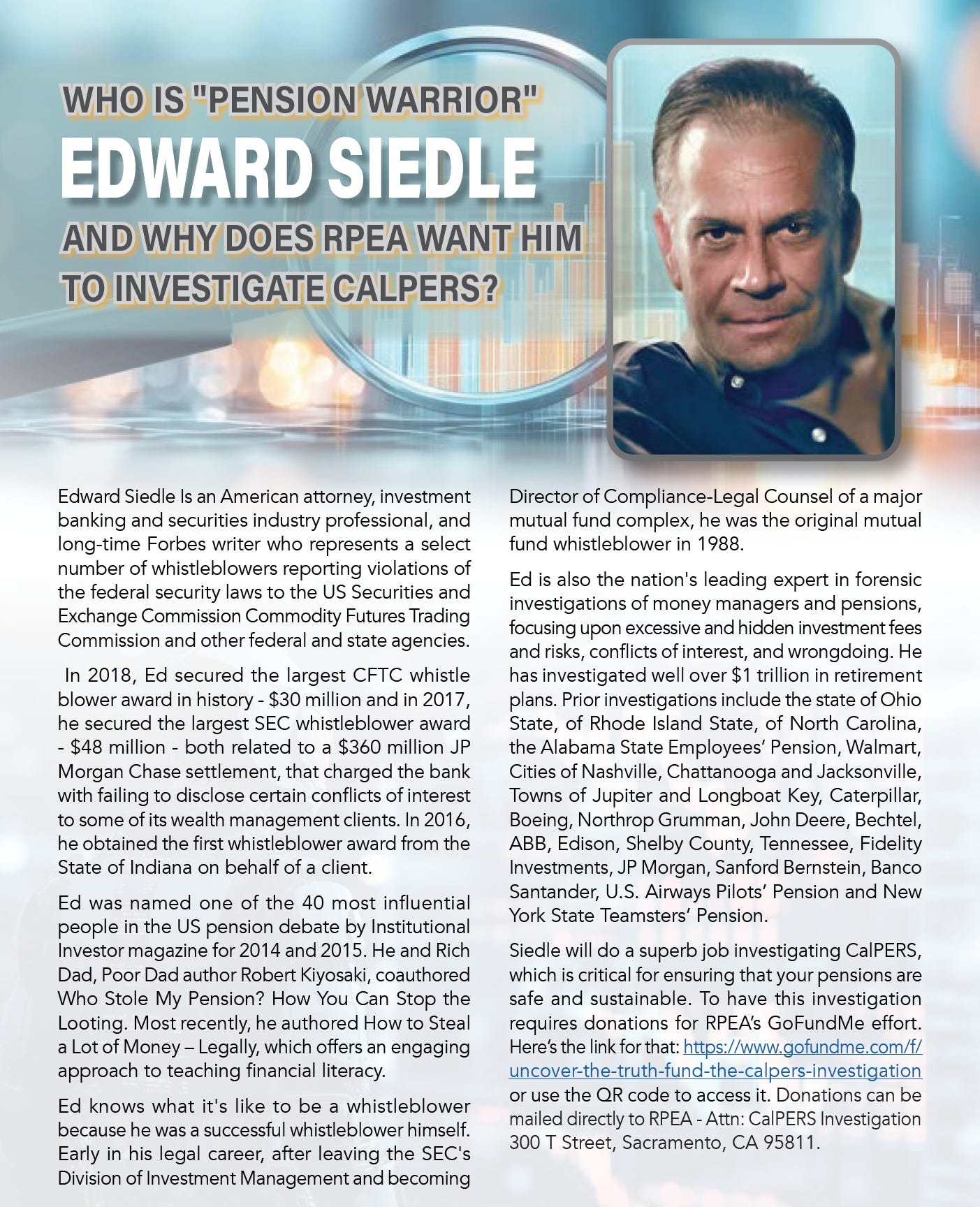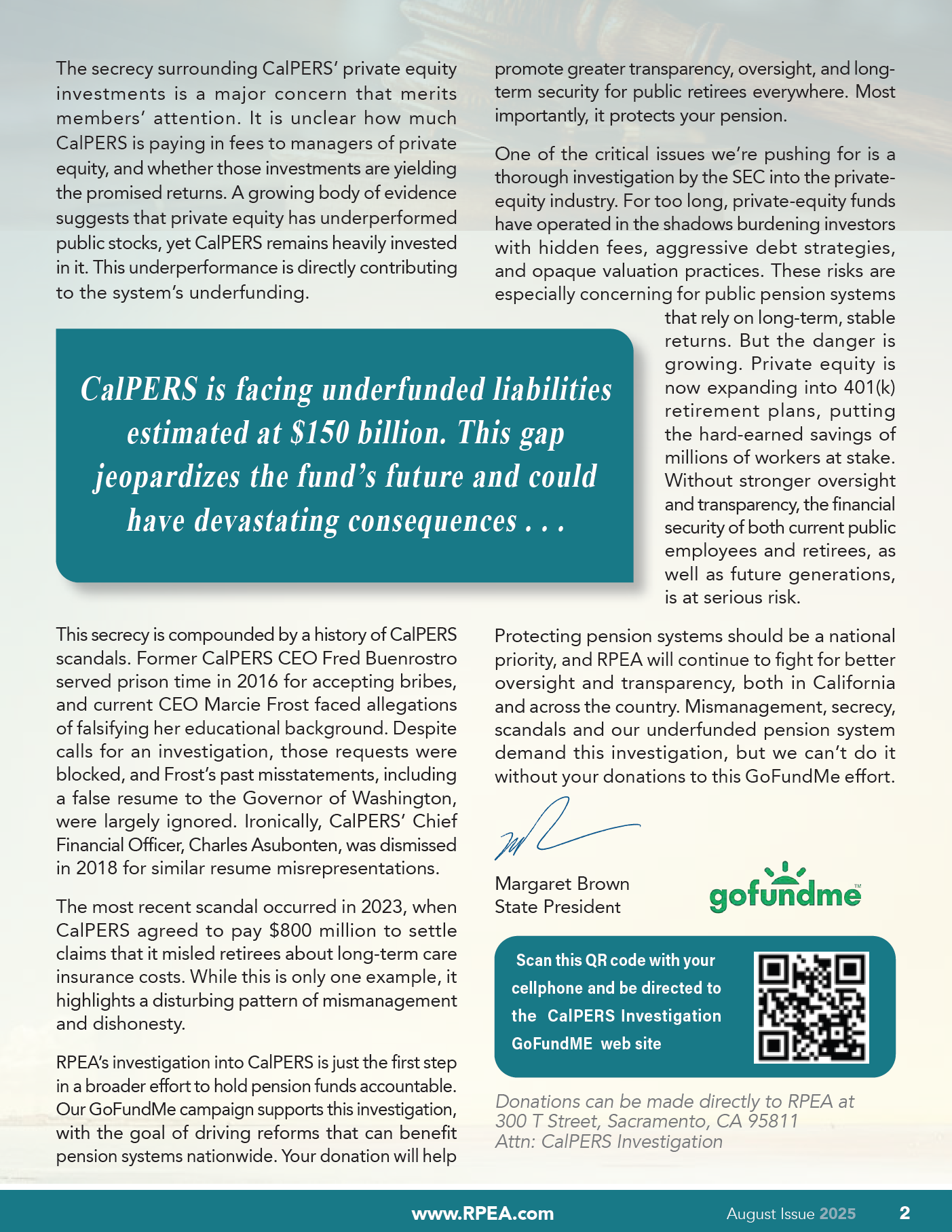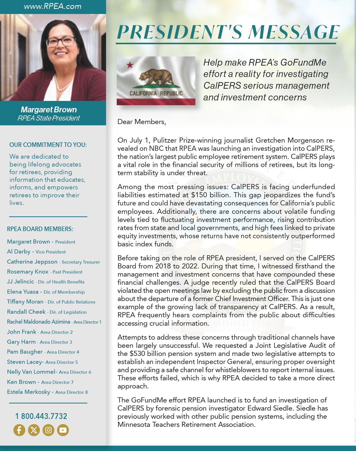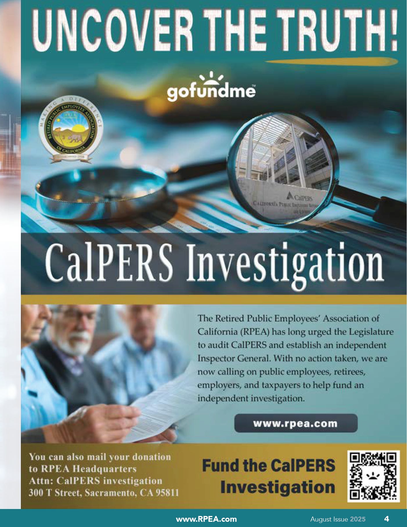 California Retired Public Employees Unite For CalPERS Forensic Investigation RPEA's August 2025 Magazine Profiles Upcoming Forensic Investigationedward siedleAug 21, 202561ShareTo view the full magazine click here. To view the GoFundMe click here. Subscribe