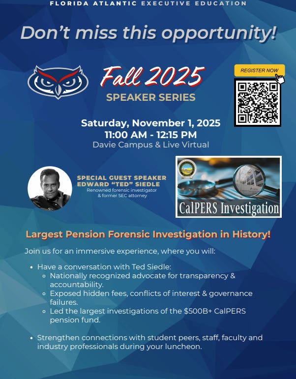 On Saturday, November 1, 2025, Florida Atlantic University students will be introduced to the secretive dealings of America’s state and local public pensions, invited to participate in an ongoing investigation of the nation’s largest state pension (California Public Employees Retirement System) and begin a lifelong course of learning about the management/mismanagement of these massive plans.